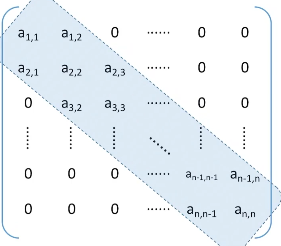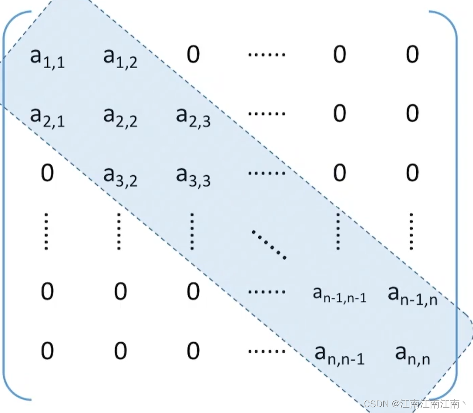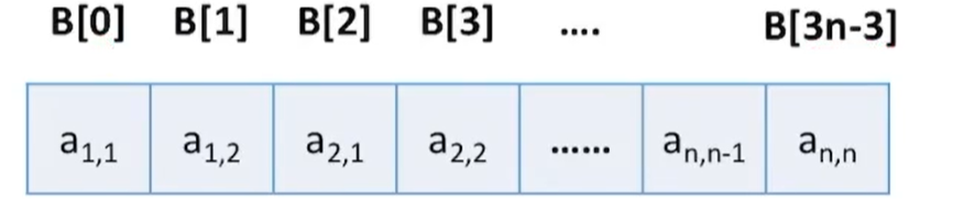 2.特点 :除了第一行和最后一行是两个元素以外,每行是三个元素,因此,共(3n - 2)个元素,数组从0开始,因此,最后一个元素的数组下标为(3n - 3)