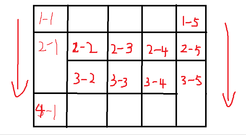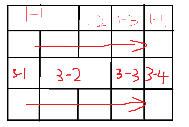 我们再看第四行,第一个单元格是不是与2-1合并了,所以这一行也只有四个单元格,3-5当然也算啦,它是与第四行单元格合并的