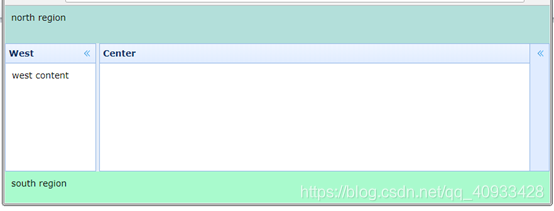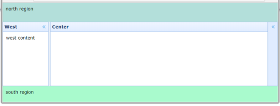 <body class="easyui-layout"> <div data-options="region:'north',border:false" style="height:60px;background:#B3DFDA;padding:10px">north region</div> <div data-options="region:'west',split:true,title:'West'" style="width:150px;padding:10px;">west content</div> <div data-options="region:'east',split:true,collapsed:true,title:'East'" style="width:100px;padding:10px;">east region</div> <div data-options="region:'south',border:false" style="height:50px;background:#A9FACD;padding:10px;">south region</div> <div data-options="region:'center',title:'Center'"></div> </body> |
