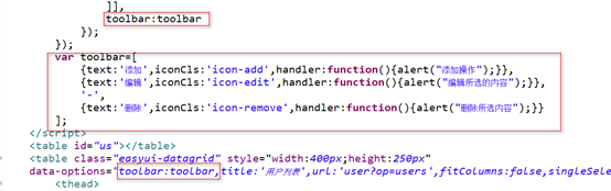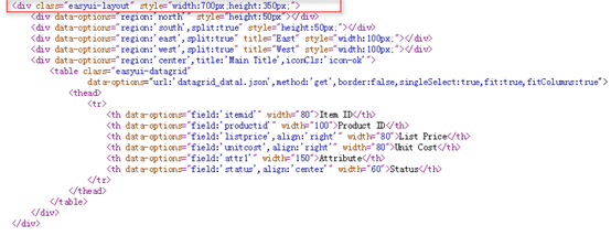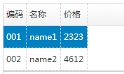 <table class="easyui-datagrid"> <thead> <tr> <th data-options="field:'code'">编码</th> <th data-options="field:'name'">名称</th> <th data-options="field:'price'">价格</th> </tr> </thead> <tbody> <tr> <td>001</td> <td>name1</td> <td>2323</td> </tr> <tr> <td>002</td> <td>name2</td> <td>4612</td> </tr> </tbody> </table> |