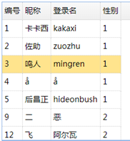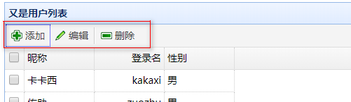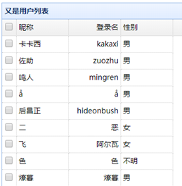 <script type="text/javascript"> $(document).ready(function(){ $("#us").datagrid({ title:"又是用户列表", url:"user?op=users", fitColumns:false, columns:[[ {field:'uId',checkbox:true,width:50}, {field:'nickName',title:'昵称',width:100}, {field:'loginName',title:'登录名',width:100,align:'right'}, {field:'gender',title:'性别',width:100,formatter:function(value,row,index){ varv ='男'; if(value==2){ v ='女'; }else if(value==0){ v ='不明' } returnv; }} ]] }); }); </script> <table id="us"></table> |