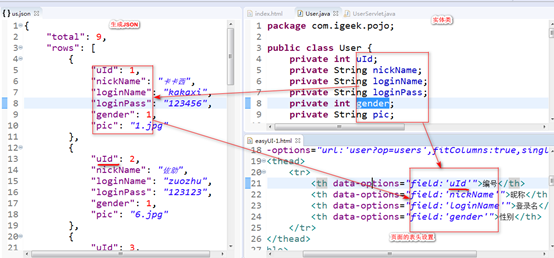 {“total”:268, Rows:[ {“uid”:1,”nickName”:”卡卡西”,”loginNmae”:”kakaxi”..}, {“uid”:1,”nickName”:”卡卡西”,”loginNmae”:”kakaxi”..}, ….. ] } |