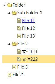 <ul id="tt" class="easyui-tree"> <li> <span>Folder</span> <ul> <li> <span>Sub Folder 1</span> <ul> <li> <span><a href="#">File 11</a></span> </li> <li> <span>File 12</span> </li> <li> <span>File 13</span> </li> </ul> </li> <li> <span>File 2</span> <ul> <li><span>文件111</span></li> <li><span>文件222</span></li> </ul> </li> <li> <span>File 3</span> </li> </ul> </li> <li> <span>File21</span> </li> </ul> |