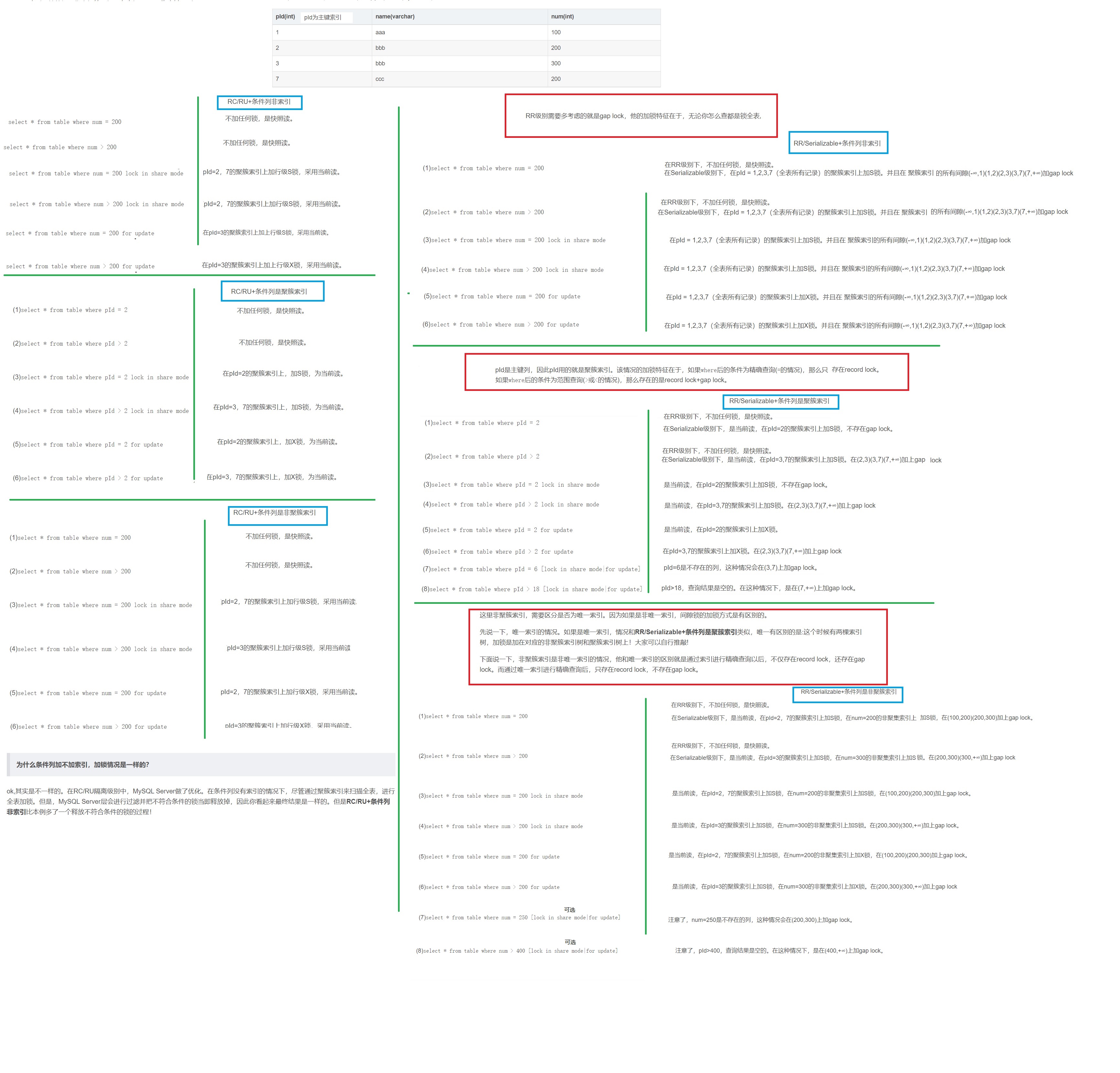 当num = 200,由于num列上有索引,因此先在 num = 200的两条索引记录上加行级S锁。接着,去聚簇索引树上查询,这两条记录对应的pId=2,7,因此在pId=2,7的聚簇索引上加行级S锁,采用当前读。
