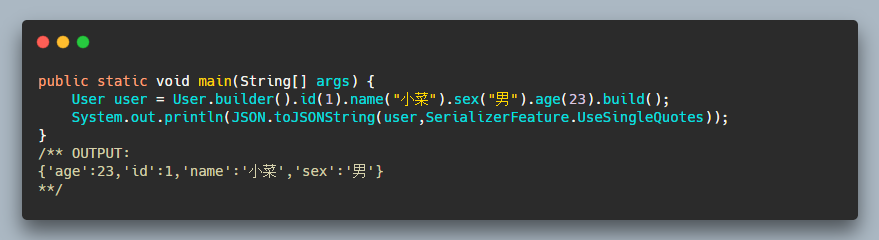 SerializerFeature.UseSingleQuotes | 使用单引号而不是双引号,默认为false |