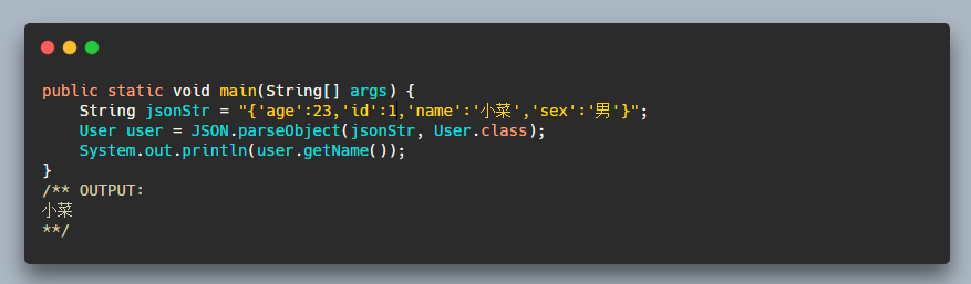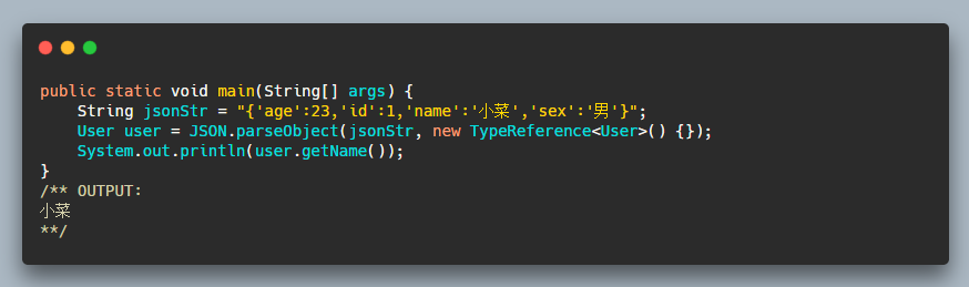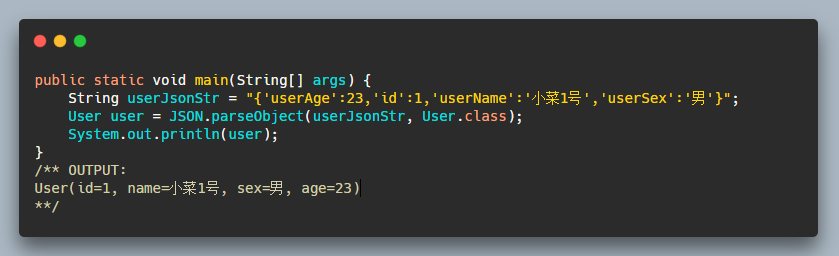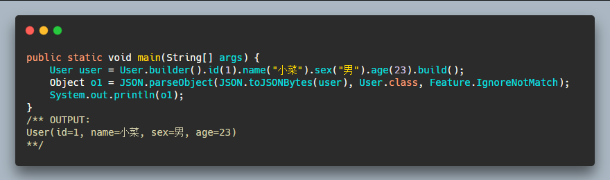 而我们要将字节数组转为对象,FastJSON 也同样支持: