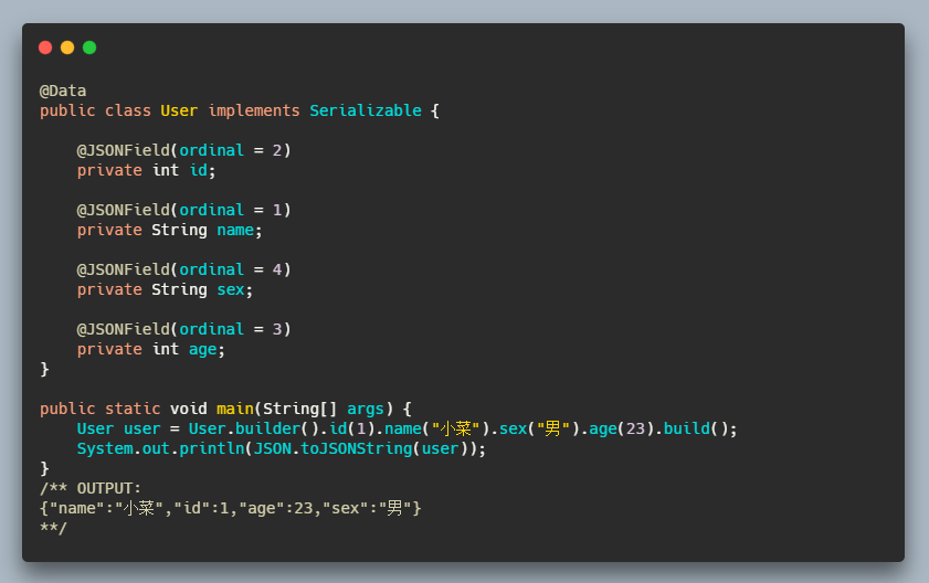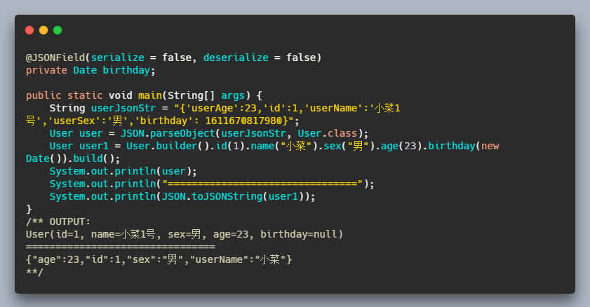 以上便是我们平时常用的 API,除此之外,在 FastJSON 中还有一个注解 @JSONField 我们也要学会灵活运用