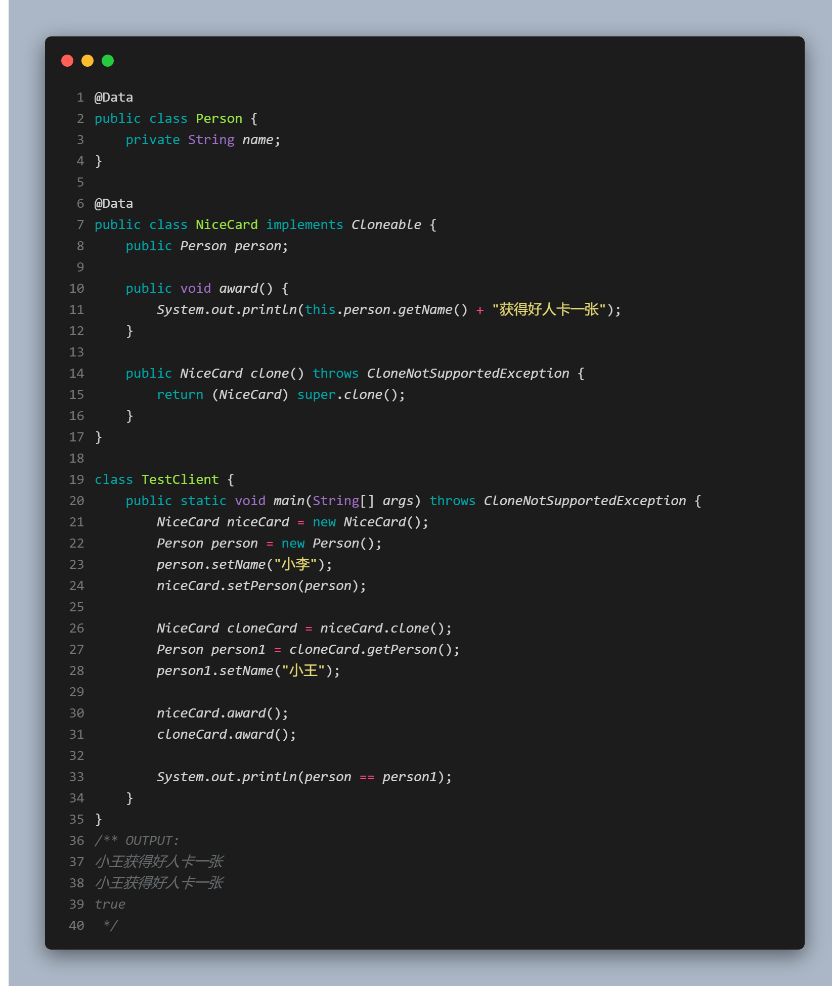 浅克隆的实现方式十分简单,我们只需要实现 Cloneable 接口,然后重写 clone() 方法 :