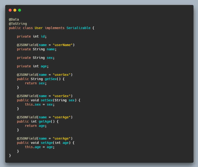 我们可以看到返回的字段名全都不满足小驼峰规则,我们定义的实体类可不能这样,借助 @JSONField 的写法如下: