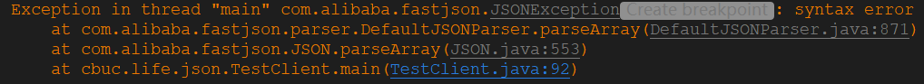 这种方式有个坑就是:我们使用 parseArray() 这个方法的时候第二个参数需要传入我们要反序列化的对象类型,但是我们这里需要传入的是数组,不知道你有没有为数组里放了两个一样的type感到奇怪?没错,这就是这个方法的坑,我们 List 里面有多少个对象, Type[] 这个数组里面的个数要与之匹配,不然会抛出以下错误: