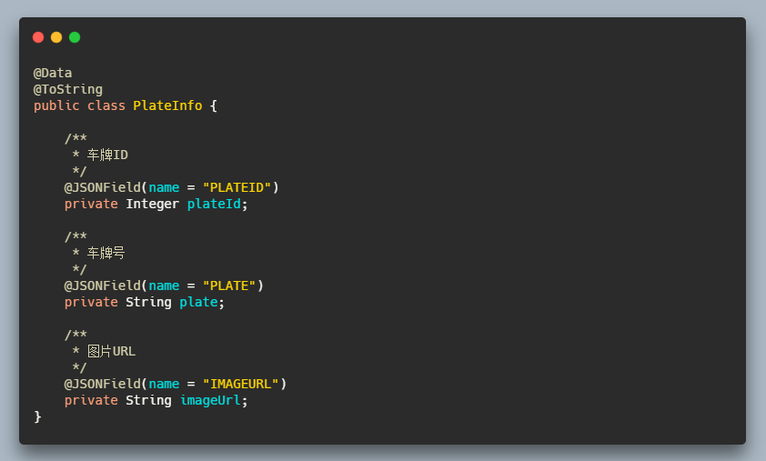 这个时候我们定义的实体类的属性名就得按照返回的字段名来命名,这对强迫症程序猿来说是致命打击,这个时候 @JSONField 的用处就来了,我们简单看个例子。有个车牌信息实体的返回字段是这样的: