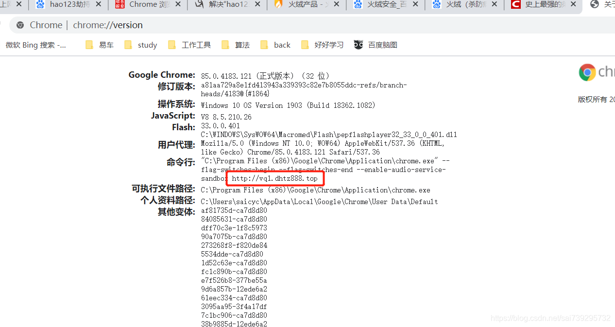 最近我给我的老电脑安装系统在我这台电脑做了启动盘,之后我的每个浏览器点开就是hao123 的主页,而后我用了360和腾讯杀毒我发现都不好使于是乎,我研究了一下我的浏览器启动执行命令chrome://version/。