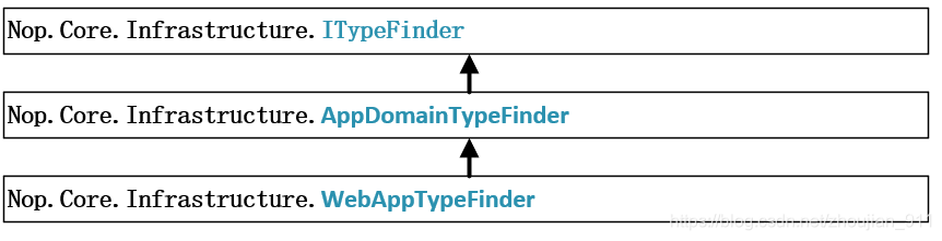 AppDomainTypeFinder类,继承于ITypeFinder接口,同时也被WebAppTypeFinder类所继承,该类定义了程序集加载方法、验证模式(规则)属性。该类从开发者自定义的程序集和存储于应用程序域实例中的程序集中检索出所有符合验证模式(规则)程序集,并通过这些程序集(Assembly)中的接口/抽象类/类获取(检索)相应的具体实现类的类型实例,为构建抽接口/抽象类/类与相应的具体实现类的相互映射关系,以反射注入方式,依次注入到默认依赖容器或第三方依赖容器中等操作提供支撑。