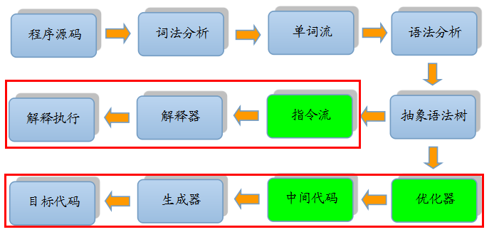 - 而下面的那条分支就是传统编译原理中从源代码到目标机器代码的生成过程。
