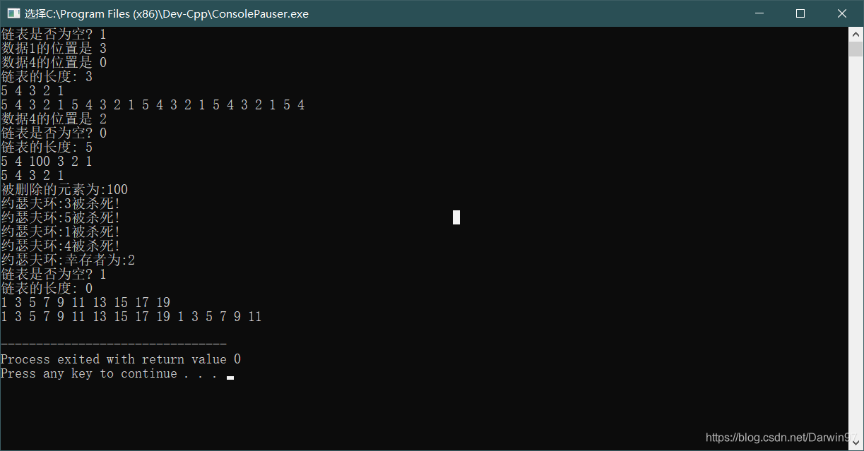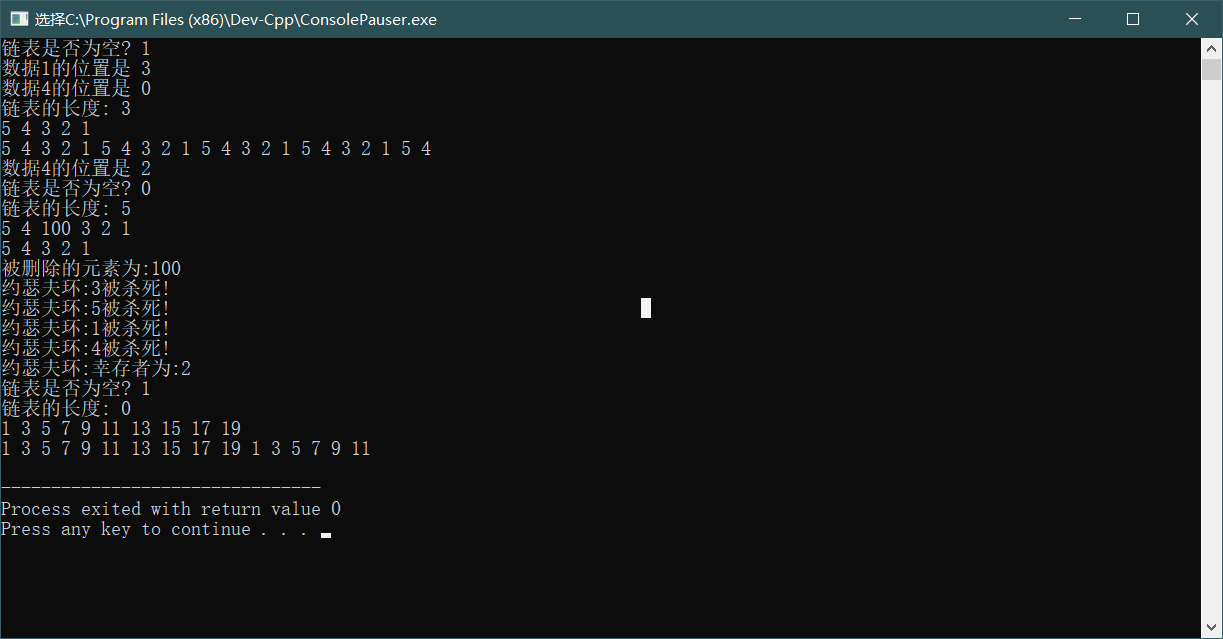 JosephusProblem(list, 3);//测试约瑟夫问题,每数3个数删除一个结点