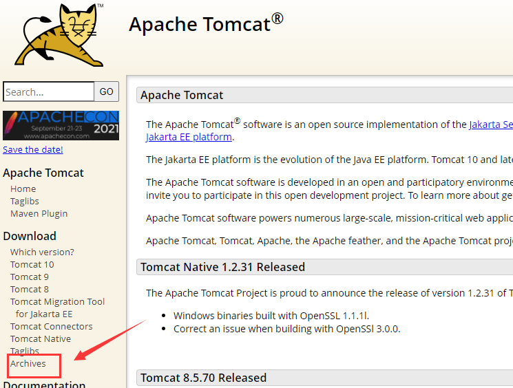 下载tomcat源码,地址:https://tomcat.apache.org/