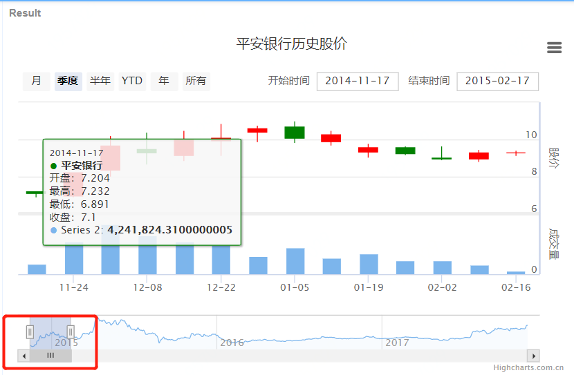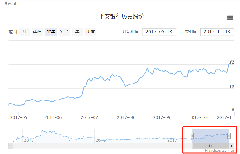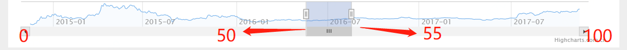在前端以曲线图的形式展示数据时,由于数据往往较多,常常会在x轴添加滚动条(highstock),如果不进行相关设置的话,滚动条的初始位置在x轴的最左端,如图: