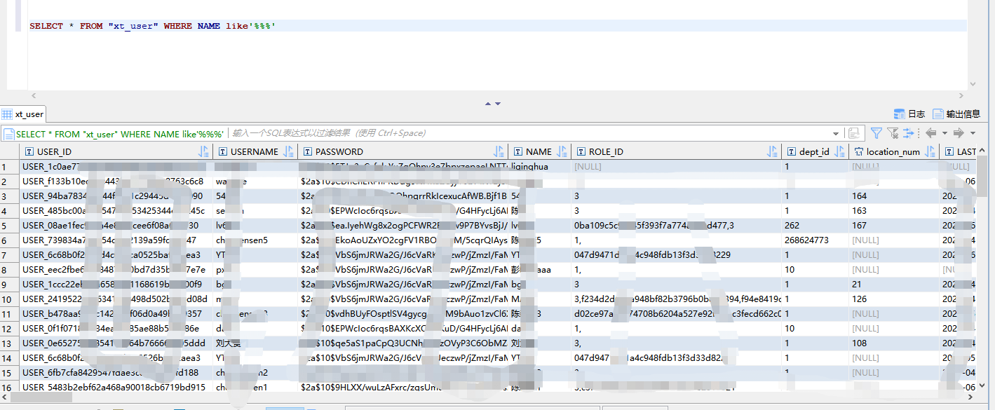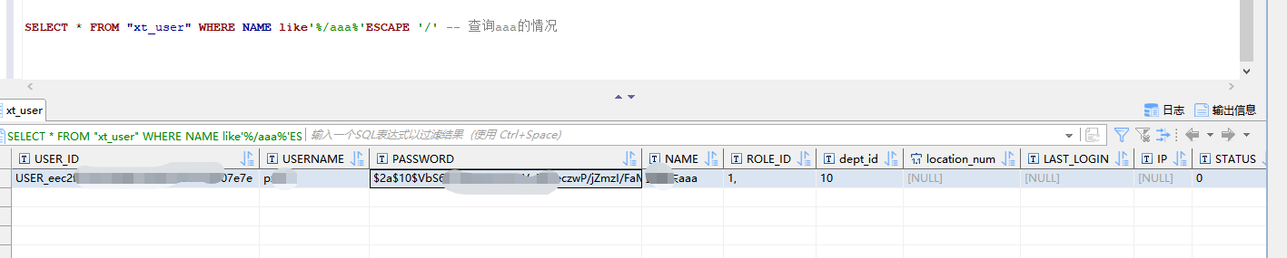 从上述查询中,可以看出,在like关键字查询的时候,在第一个模糊查询的百分号后面加入一个斜杠(/),在整条sql后面加上'ESCAPE '/' ,就会把斜杠后面的字符转义,这样就不用担心特殊字符导致整个sql查询失败了