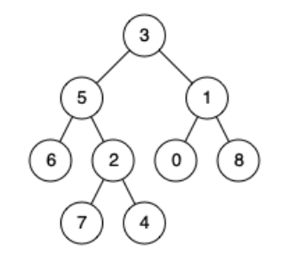输入:root = [3,5,1,6,2,0,8,null,null,7,4], p = 5, q = 1