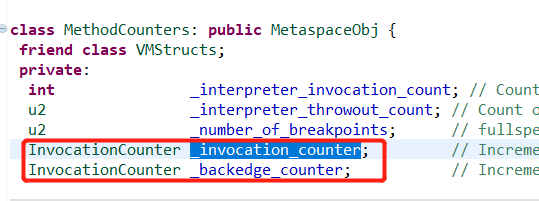 MethodCounters用于热点代码跟踪中的方法调用计数,其中MethodData用于保存JIT编译器为了优化代码而收集的方法执行性能相关数据,初始化为null。两者都定义了两个InvocationCounter的属性,且属性名一样,以MethodCounters为例,如下: