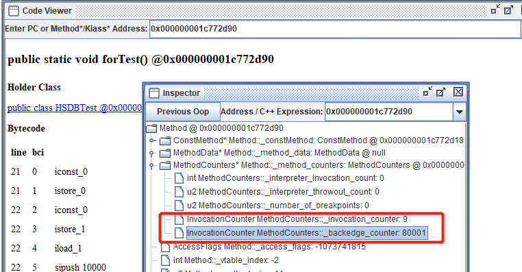 其中_invocation_counter记录方法调用的次数,_backedge_counter记录循环跳转的次数,可以用如下测试用例说明: