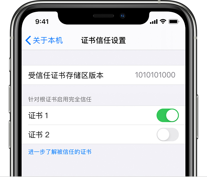 要为这个证书开启受 SSL 信任,请前往“设置”>“通用”>“关于本机”>“证书信任设置”。在“针对根证书启用完全信任”下,开启对这个证书的信任。