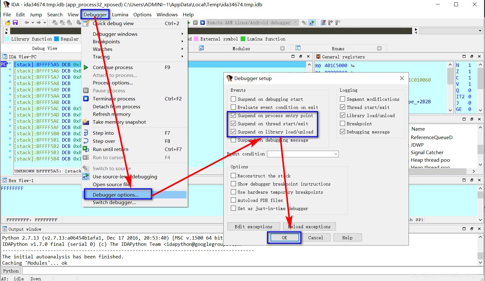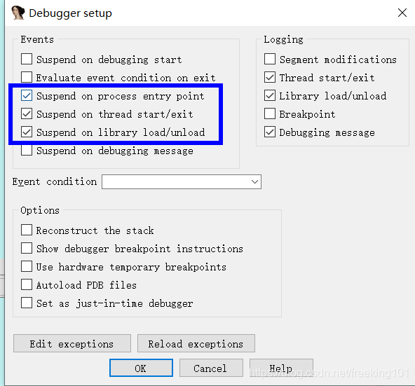 勾选三项,在 进程入口点、线程开始和退出、so加载和卸载的时候 断下来。