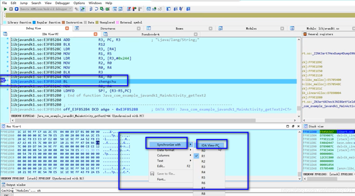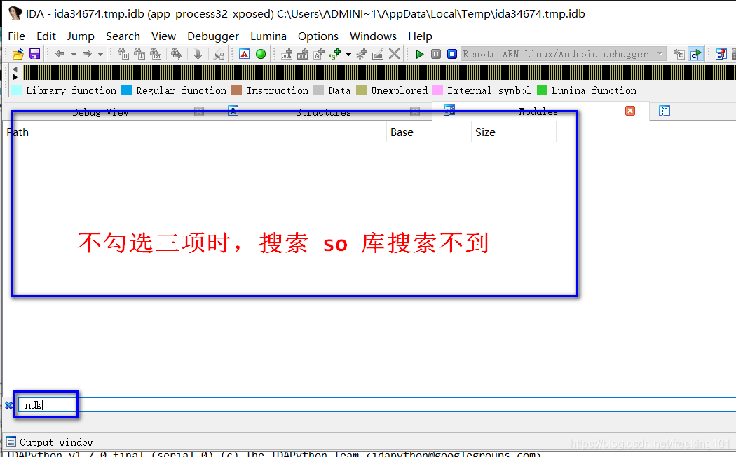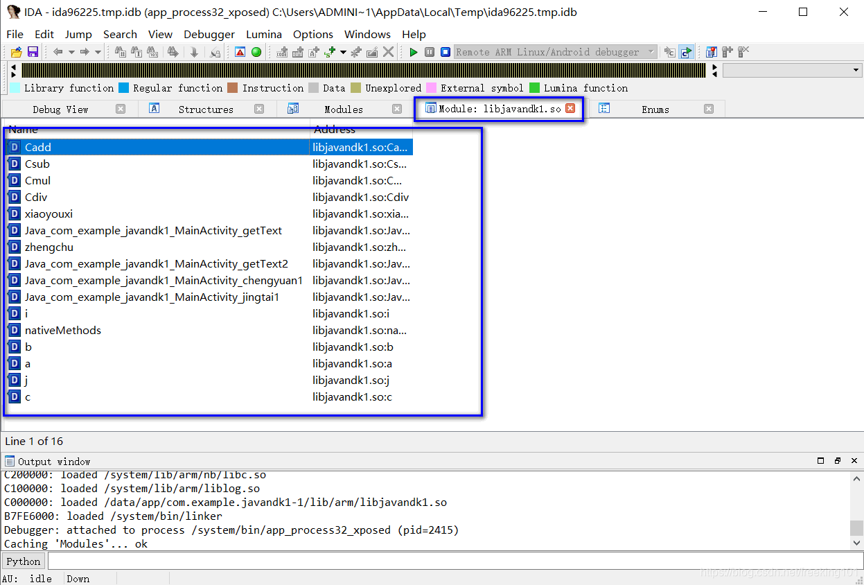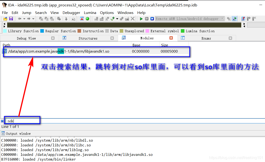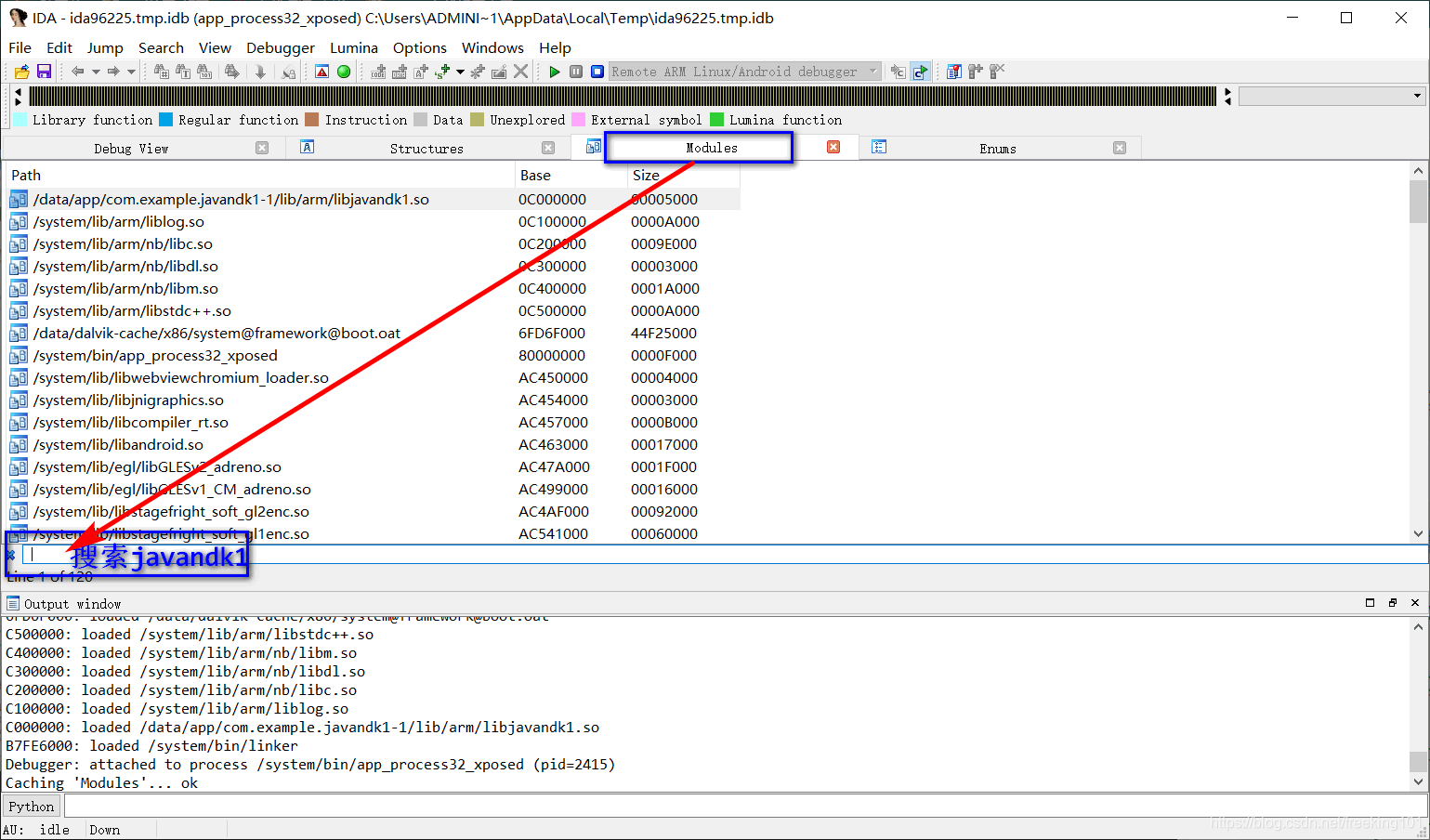 IDA Pro 的 Modules这个子窗口功能是 "列出加载的所有 so",所以可以在 Modules里面搜索 要调试的so库 javandk1
