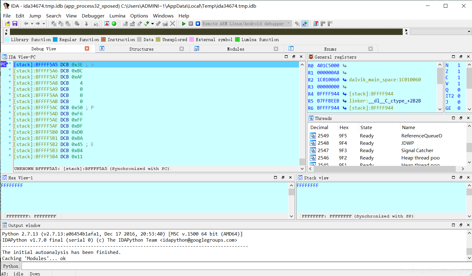查看 IDA 下面的 log 输出,看要调试的so是否加载,