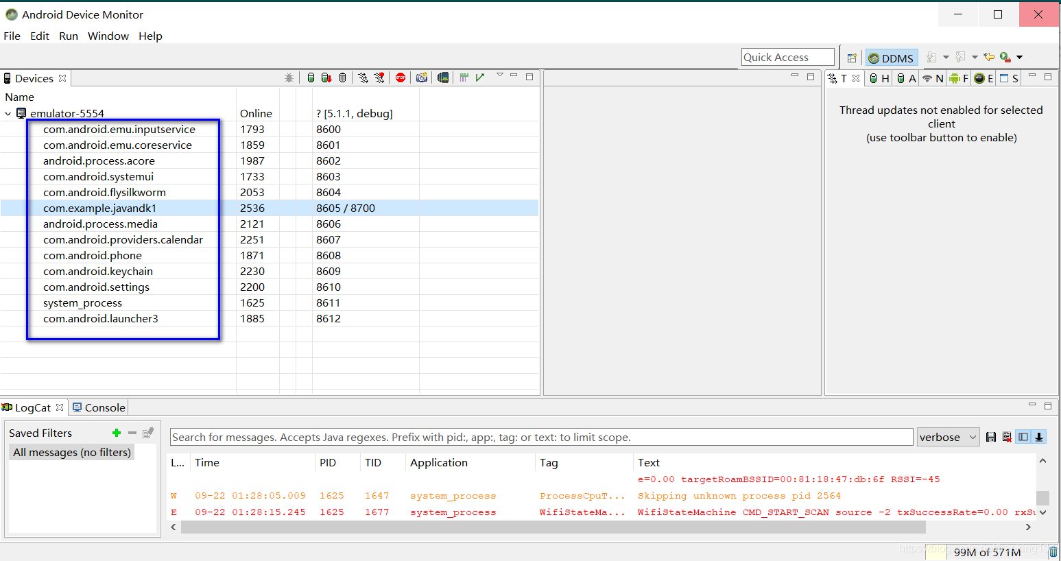 补充:此时观察 DDMS,被调试的程序前面有一个 红色 的虫子;