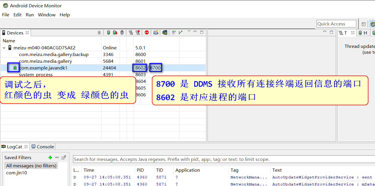 补充:此时观察 DDMS,被调试的程序前面有一个 绿色 的虫子;