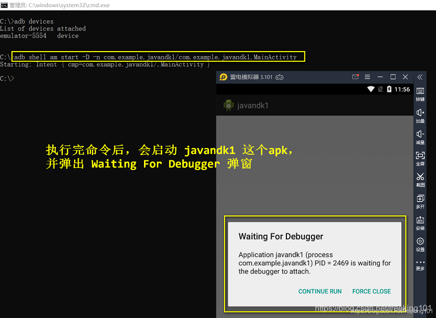 命令:adb shell am start -D -n com.example.javandk1/.MainActivity
