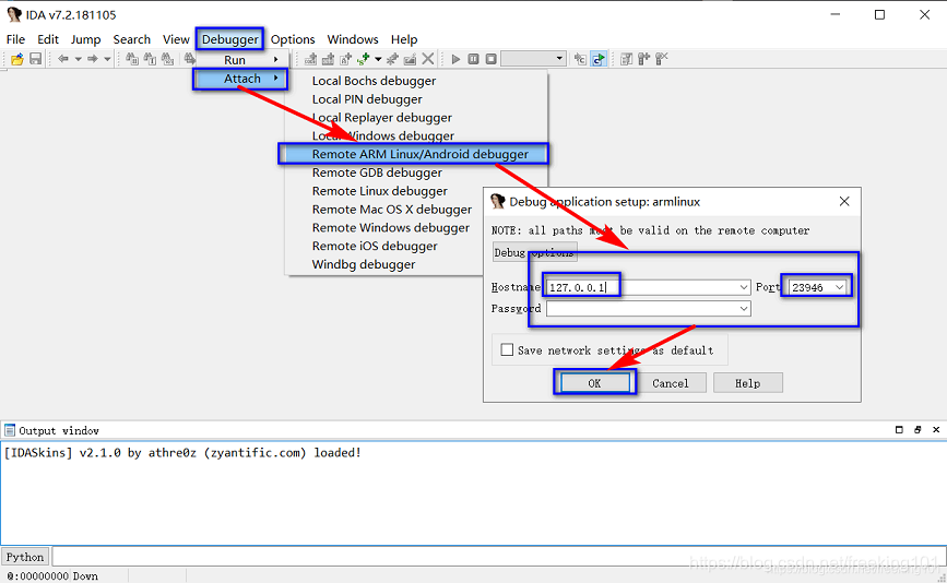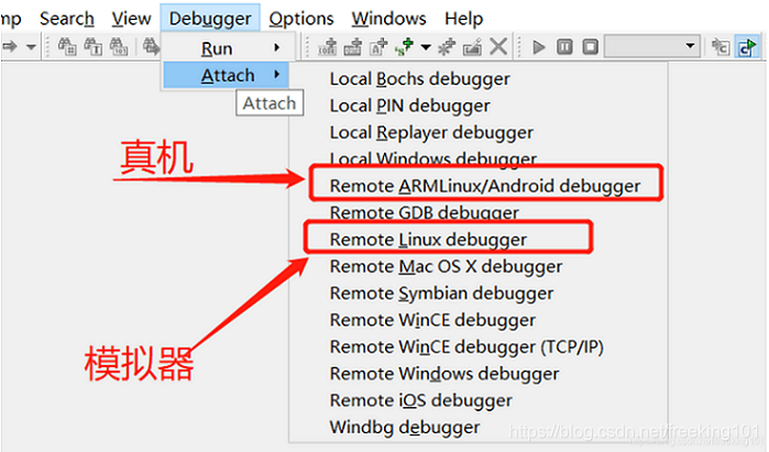 1)打开ida ---> 工具栏的debugger ---> Attach ---> Remote ARMlinux(第四项)