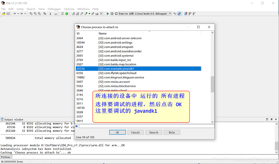 3)出来进程列表:选择要调试的程序( 可以 ctrl+f,搜索包名)