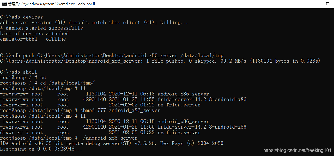 所以选择 andriod_x86_server文件,使用 adb push 传文件到 模拟器,并添加 可执行 权限,然后运行。