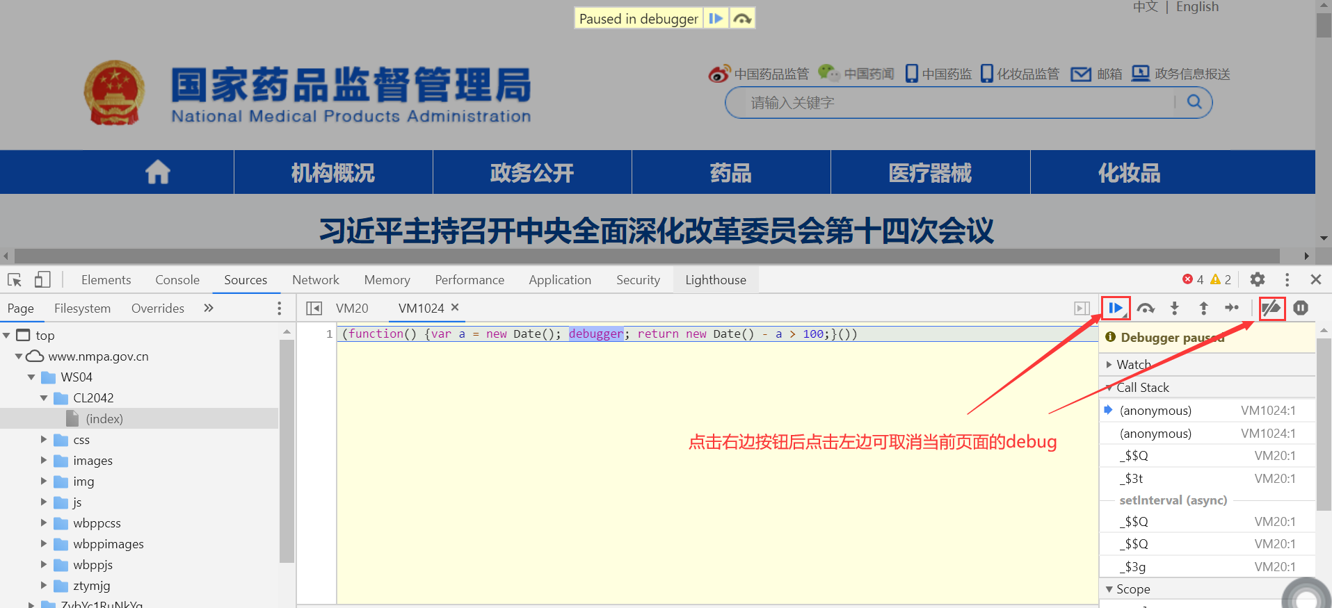 可取消断点按钮后刷新取消,也可以找出出发debug的js函数用重新成空函数后在控制台执行取消