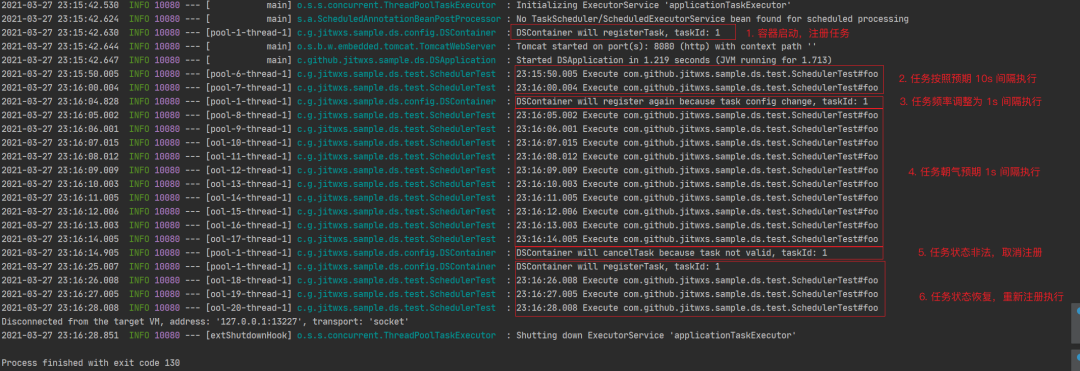 •服务启动后,foo() 定时任务将每 10s 执行一次。•10s 后,将 foo() 定时任务执行周期从每 10s 执行调整为 1s 执行。•10s 后,关闭 foo() 定时任务执行。•10s 后,开启 foo() 定时任务执行。