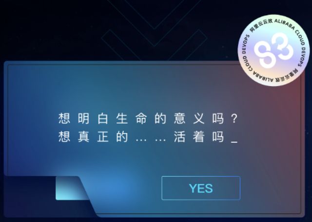 最后一个问题:怎么创造生命的意义?这个其实是稍微有一点难的,不像前两题这么直观,需要看完整个剧情,就会发现剧情里主要强调一点是技术的力量,第三段代码中也明确提到了在经历了人生的大转折之后,向往Technology的力量,学习了DevStudio的知识,Yunxiao的知识,Devops的知识,Cosy的知识,思考生命的价值。所以这一题的答案是技术(Technology),或者DevStudio、Yunxiao、Devops、Cosy都是可以的。