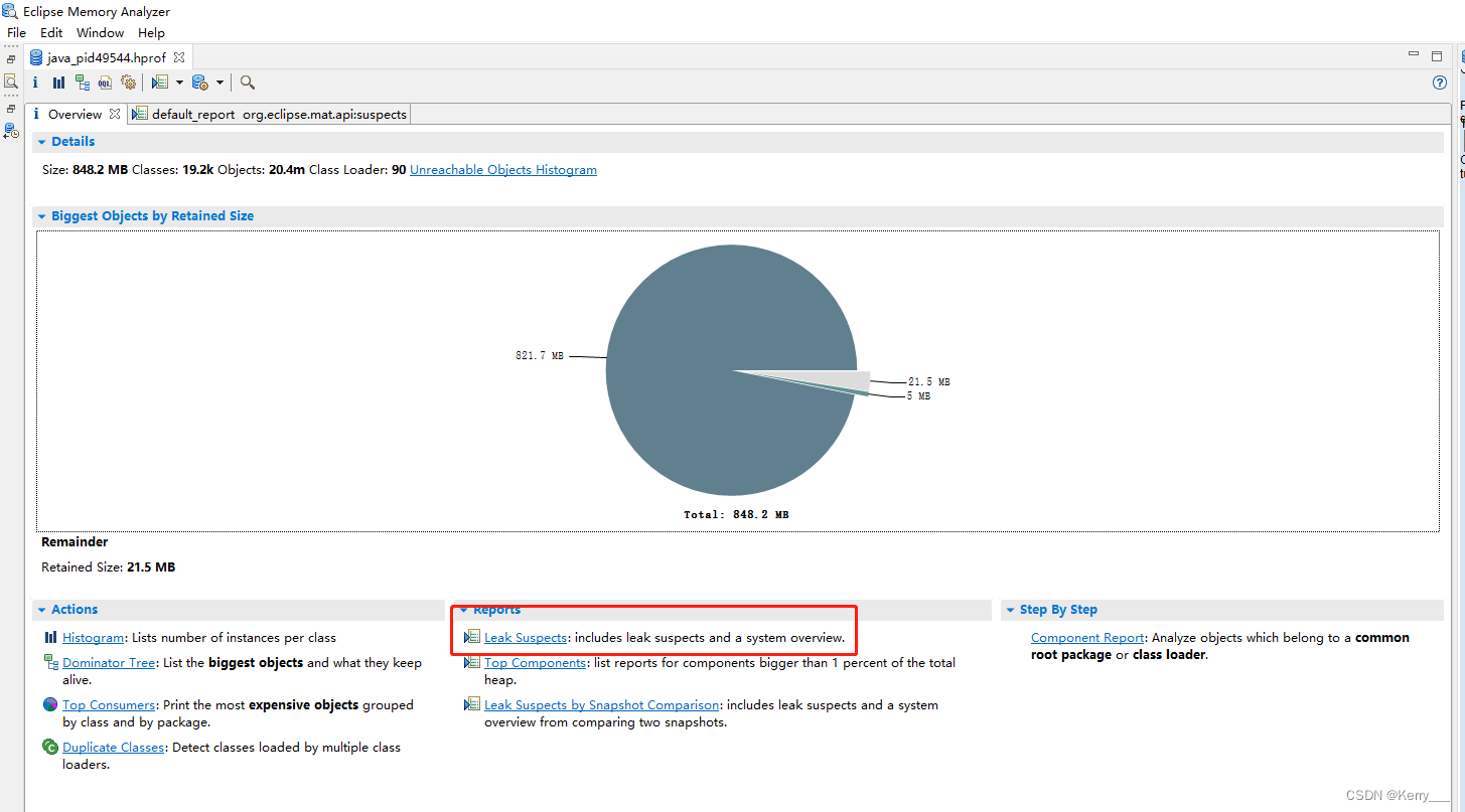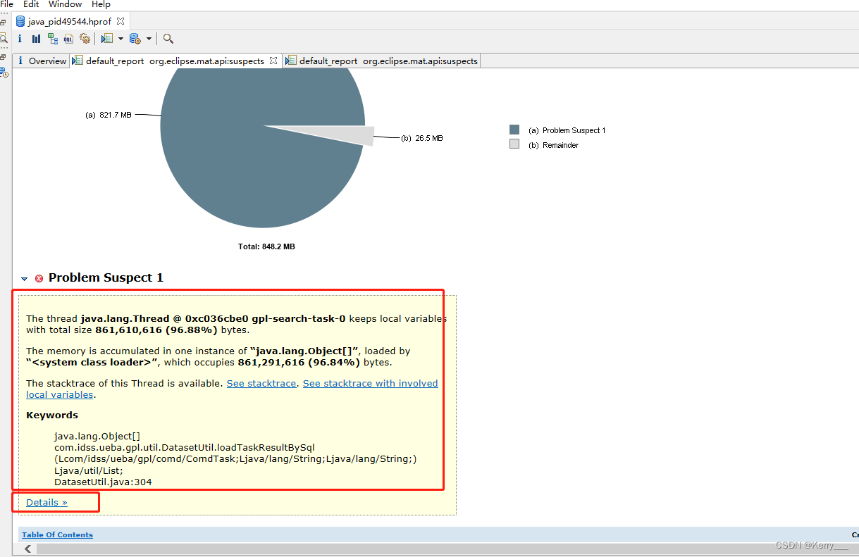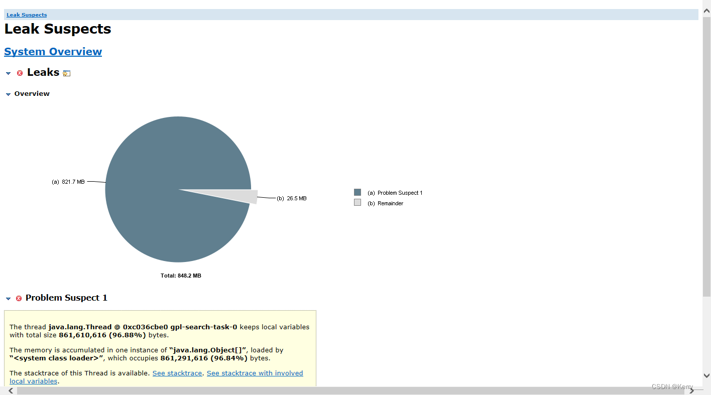 此时可以点击 Leak_Suspects 进一步查看详细分析信息