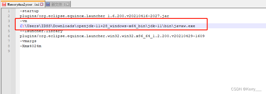 下载成功后,可是我并不想替换原来系统中的jdk8的环境,所以,此时可在MemoryAnalyzer.ini中配置vm的运行环境,-vm下内容为 下载的jdk11后解压后的bin目录javaw.exe