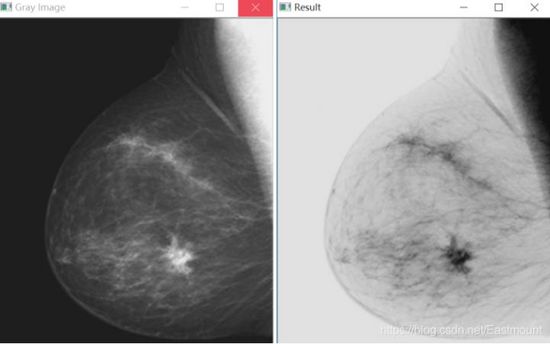 图像灰度反色变换在医学图像处理中有一定的应用,如下图所示: