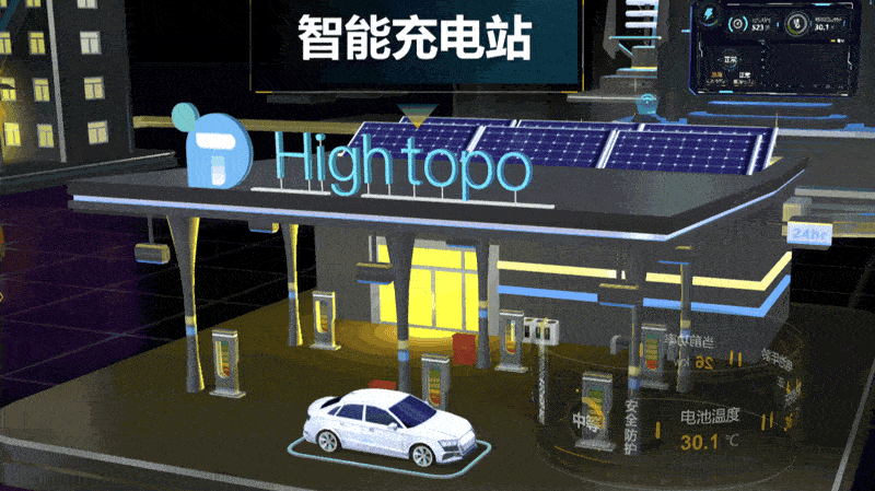通过 HT for Web 以贴图的形式设计出轻量化的智能充电站,可摆脱硬件设备的限制,实现充电桩的随时监控。模拟车辆进站的充电过程,显示智能充电桩的充电次数、当前功率、充电量、电池年限;当车辆电磁出现故障时,出现闪烁的红色框提示车站运维人员。