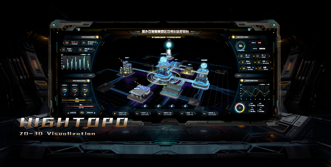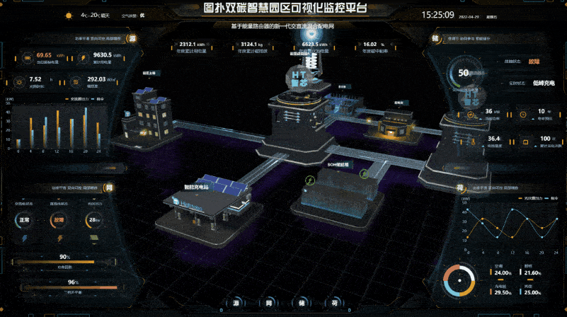 图扑软件利用自主研发引擎 HT for Web 将 Web 智慧“双碳”微电网场景进行数字孪生,有效实现源网荷储一体化管控。整体场景采用了轻量化建模的方式,重点围绕智慧园区电网联通中的源、网、荷、储四方面的设备和建筑进行建模还原,为用户带来“赛博朋克”的视觉体验。采用轻量化重新建模的方式,设计师就有“设计”的发挥空间,展现更多美学创意。支持 360 度观察虚拟园区内源网荷储每个环节的动态数据。