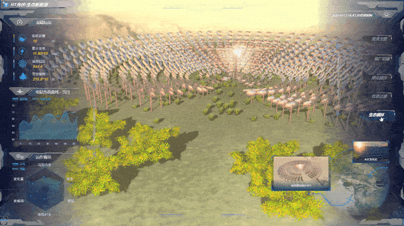 利用HT for Web渲染出多彩的光伏发电基地,通过智慧巡检、远程监控制定光伏板清洁计划和农产品的种植计划。通过对接数据接口可实现监测各方阵内汇流箱(包括母线电压、机箱温度、电流)数据,当出现告警时,可对模型进行染红闪烁显示,方便运维人员快速定位排查问题,足不出户即可实时查看设备相关指标,可结合算法实现数据分析,短时间内若出现数据异常变化的情况,提前进行告警,提醒相关人员及时做出决策。