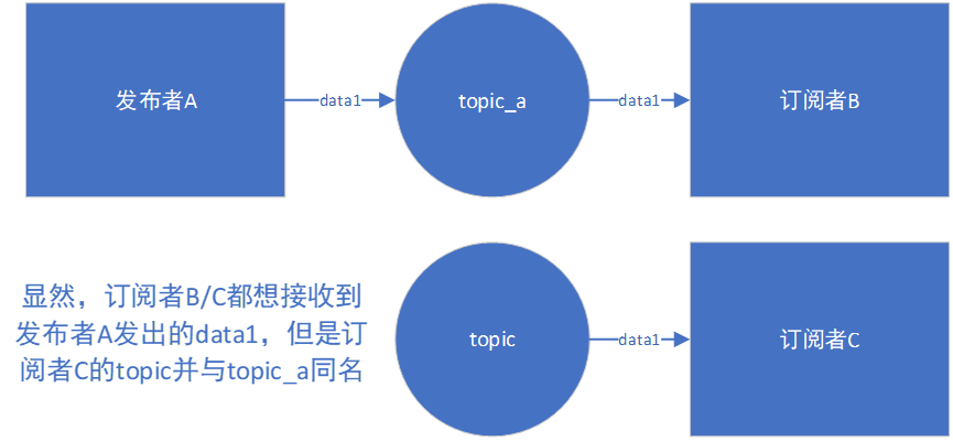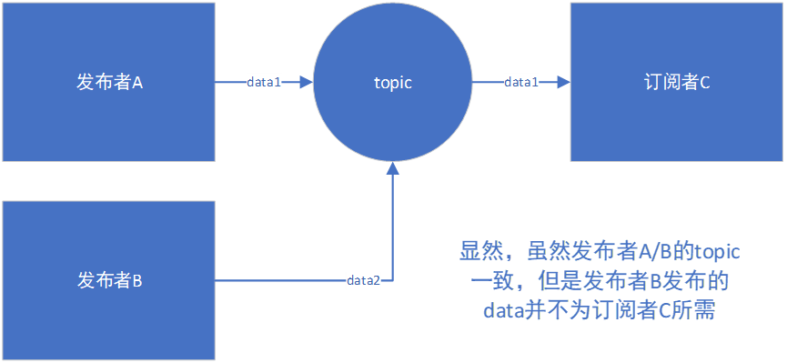 订阅者C需要的是发布者A的data1而非发布者B的data2,所以我们需要将发布者A/订阅者C之间的topic映射为topic_a,使得订阅者C又可以接收到发布者A的data1,同时不改变发布者B的topic:
