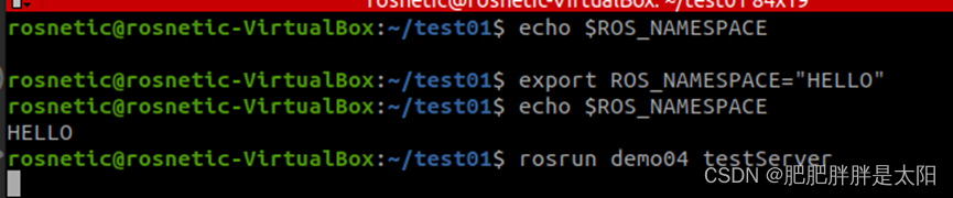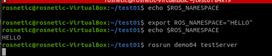 一开始ROS_NAMESPACE的内容为空,我们将ROS_NAMESPACE设置为HELLO之后,在运行以下cpp源文件,结果如下图所示: