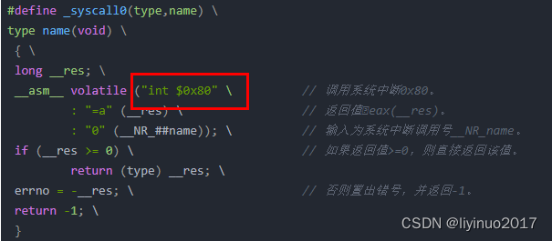 以_syscall0为例,_syscall0为不带参数的系统调用宏函数,它以嵌入汇编的形式调用软中断指令int 0x80。