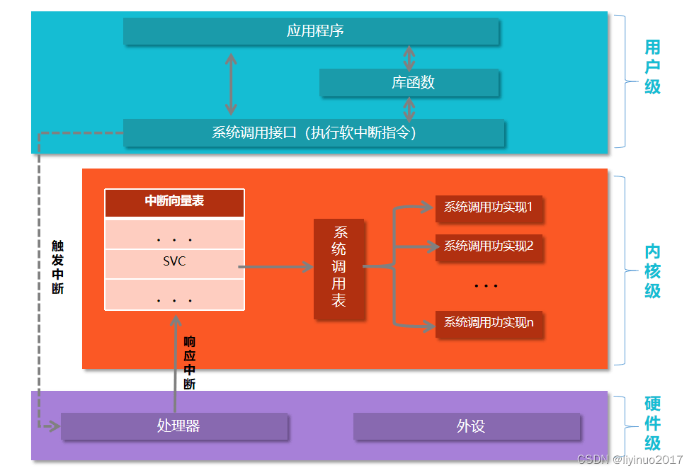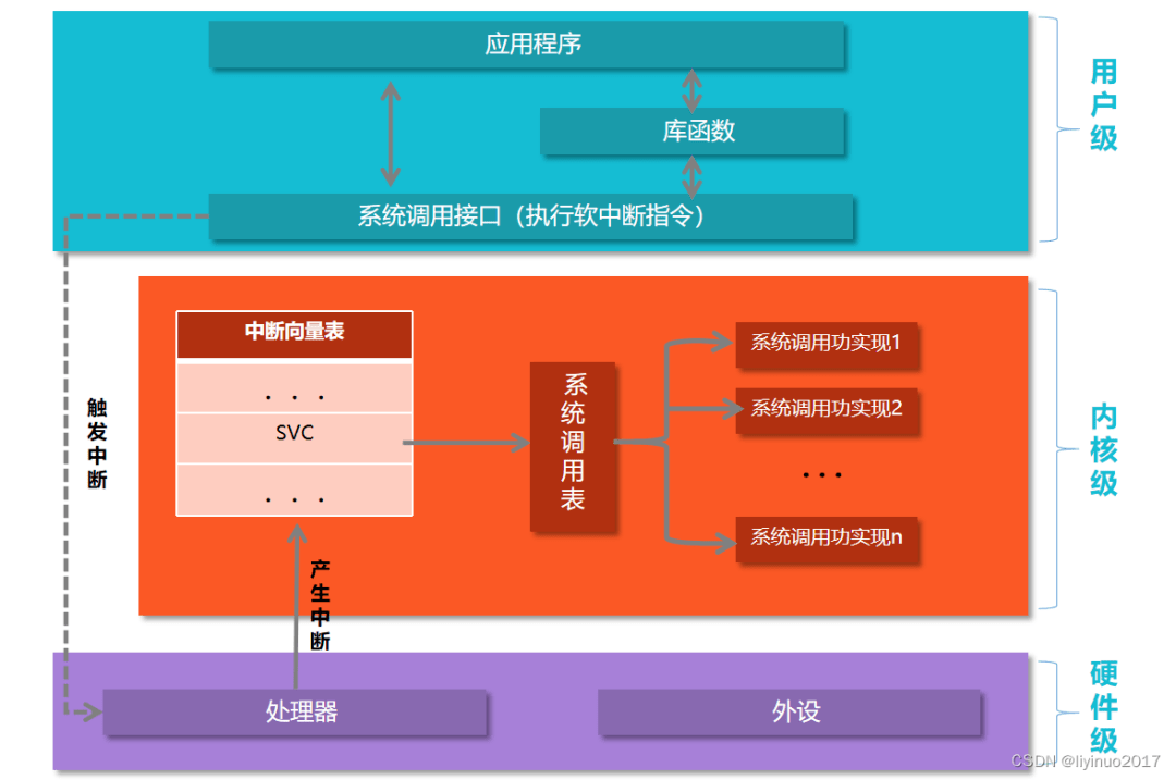 系统调用提供给应用程序的 调用请求接口,调用请求中执行了 软中断的指令,应用程序使用调用请求后, 处理器会产生一个中断,中断服务得到执行,中断服务根据 调用号执行特定的功能实现函数。