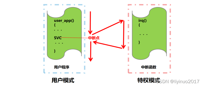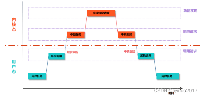 总结:系统调用使用接口函数产生软中断,处理器进入中断状态执行相应的功能程序