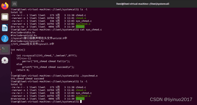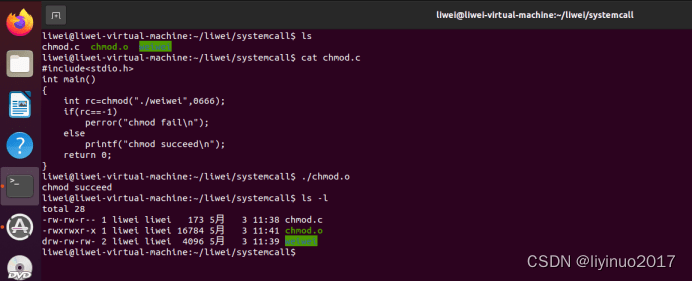 syscall(SYS_chmod,“./weiwei”,0777)函数用于改变文件weiwei的属性,编译得到syschmod.o执行文件,运行syschmod.o后观察weiwei文件的属性,结果如下:
